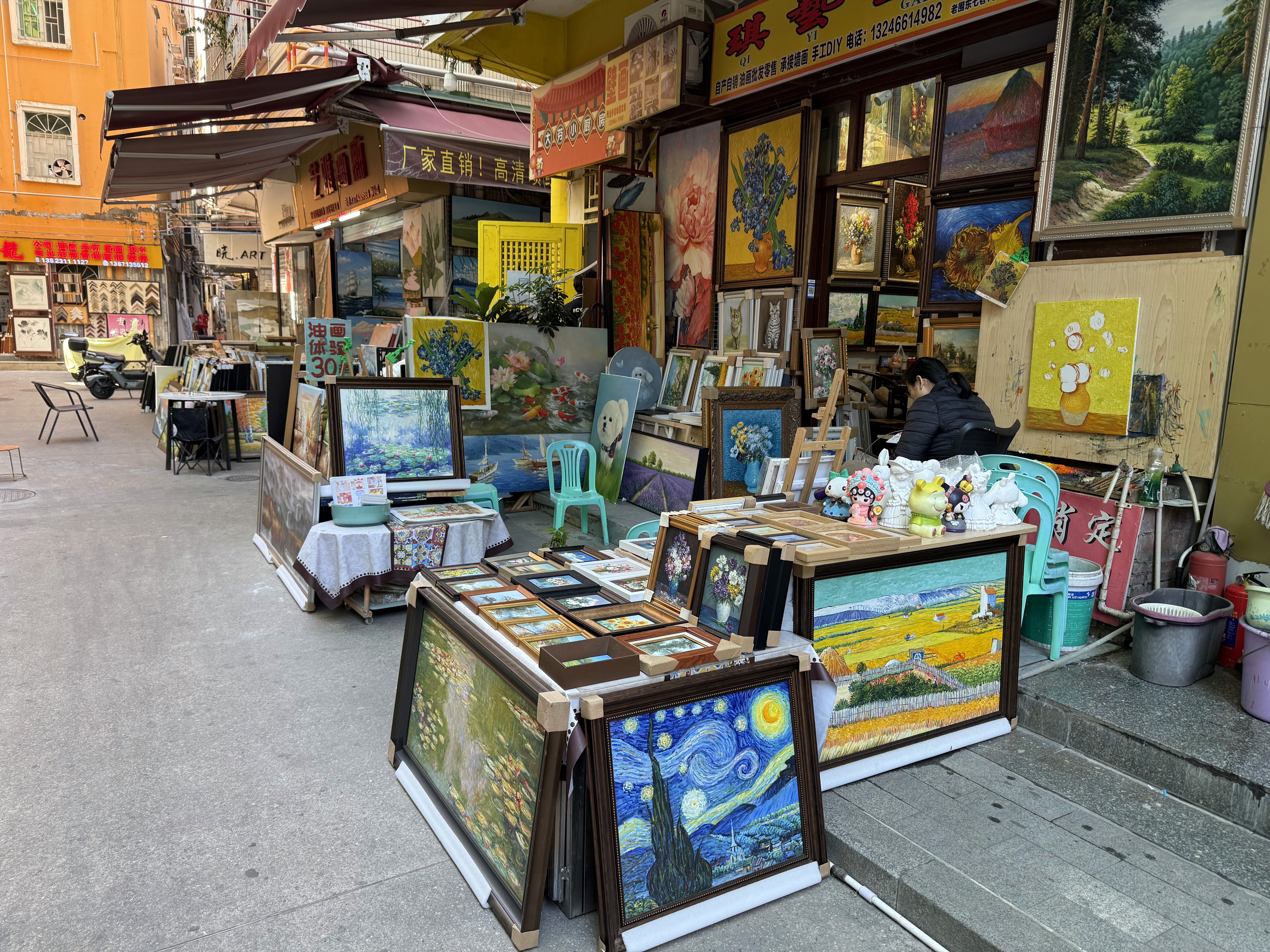 Before visiting, I had heard all the legends. Entire families painting reproductions for a living. Masterpieces sold for the price of lunch. Paintings quietly exported to hotels, offices, and living rooms across Europe and the U.S. Walking through the village, you realise most of this sagas is true. Dafen is not large—roughly eight blocks in each direction—but it is dense with production. Small studios spill into the street. Paintings lean against walls, dry in stacks, or are carried out fresh from the easel. Art is not displayed reverently here; it circulates.