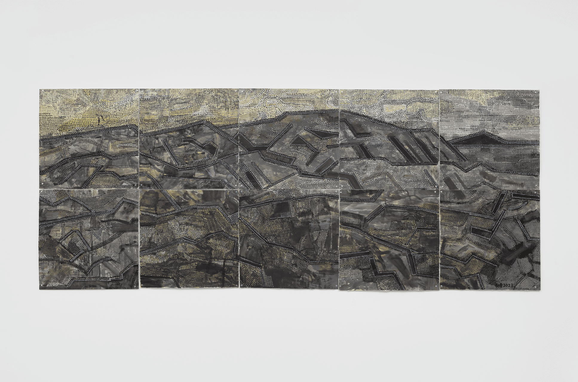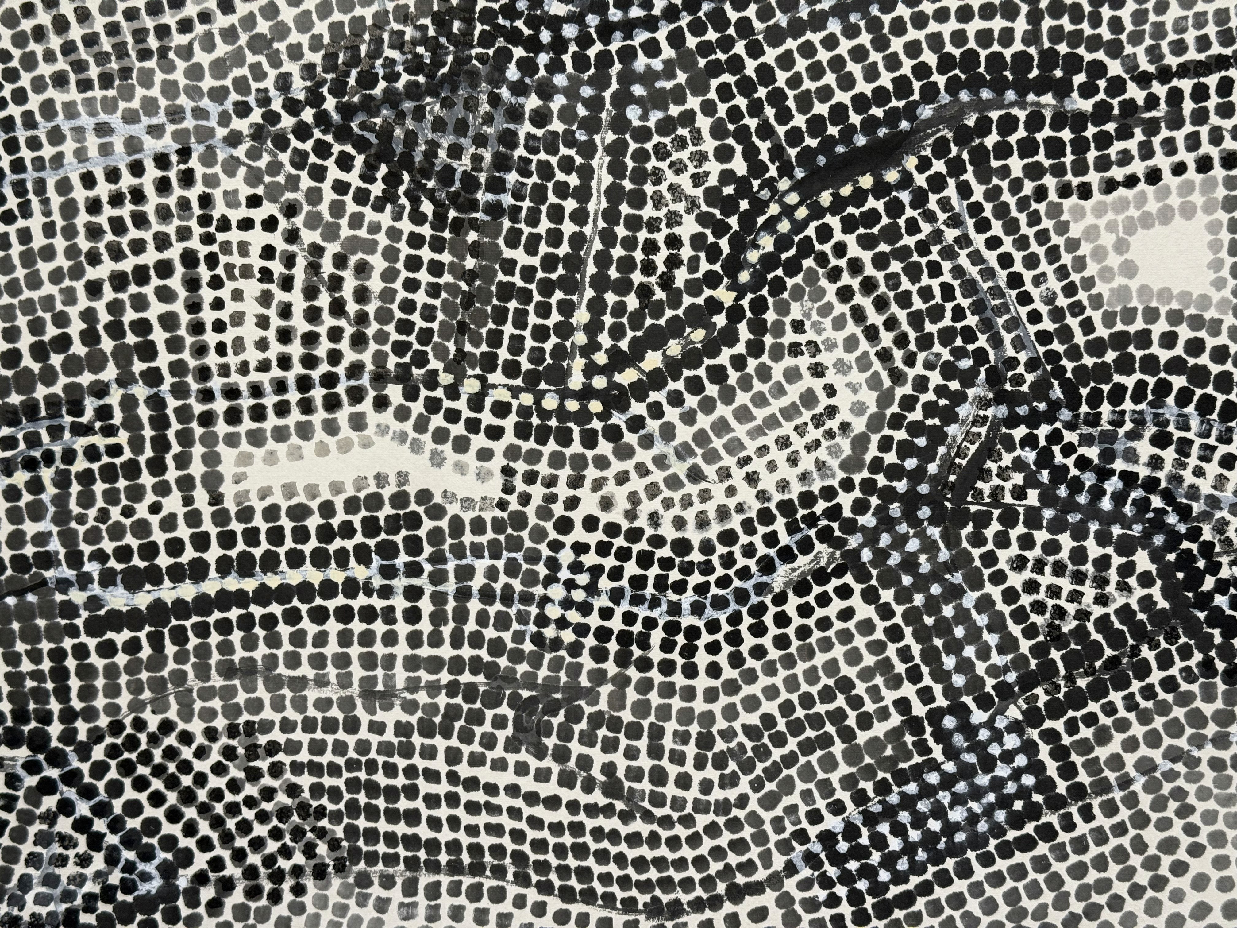 The exhibition opens with a series of large-scale composites built from layered paper panels. From a distance, the surfaces form misted landscapes—slopes, ridges, or barely-there horizons. Up close, these dissolve into vibrating matrices of dots and strokes. Western precedents inevitably come to mind: the chromatic tremors of pointillism, the earthy tactility of Dubuffet’s postwar terrains. Yet the techniques themselves remain unmistakably Asian. The beauty of ink is everywhere—the feathered edges, the tonal breaths, the slight unpredictability of fiber absorbing water. Even in works rendered chiefly in acrylic, Wang preserves this ink-born sensitivity; acrylic becomes translucent, porous, almost meditative.
